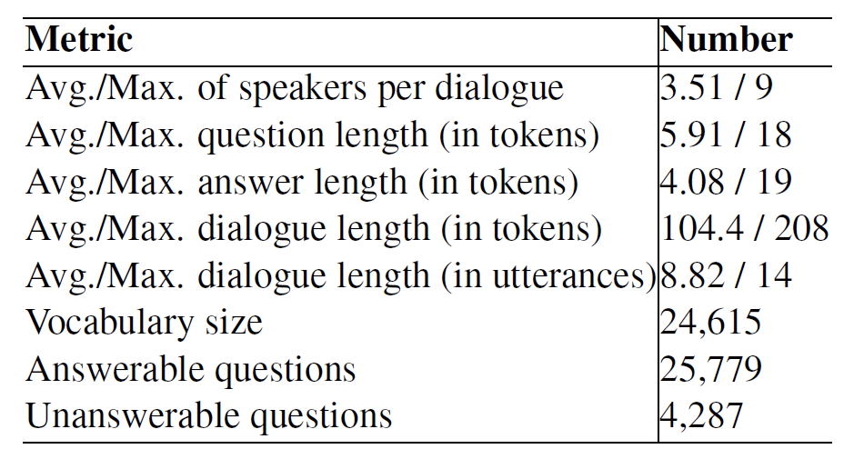 Molweni数据集源自于大规模多人对话Ubuntu聊天语料库。“Molweni”是科萨语中“你好”的复数形式,代表着与Ubuntu相同语言的多人对话。Molweni数据集包含1万个对话,88,303条话语,人工标注了78,245个语篇关系和30,066条问题,包括可回答和不可回答两种。语篇关系共分为评论、澄清_问题、详述、确认、继续、解释、条件、问答对、替换、问题-详述、结果、背景、叙述、纠正、平行、对比,16种类型。对话阅读理解任务中的可回答问题的答案都是源自对话文本中的一个片段(Span)。问题类型为5W1H,即Why、What、Who、Where、When和How。表1展示了数据集的部分统计信息。3. 结语