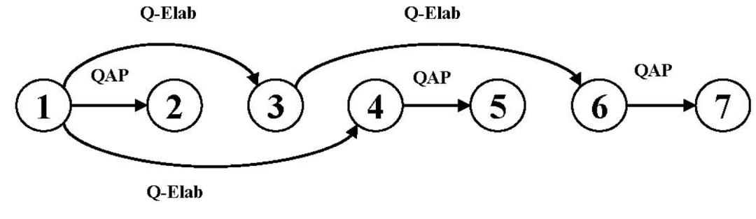机器阅读理解(MRC)是典型的人工智能应用,目的是利用人工智能技术,使计算机具有和人类一样理解文章回答问题的能力。然而,现有的对话阅读理解数据集尚未考虑到多人对话中的语篇结构,并不能够真正的评判出机器是否真正的理解了对话文本。为此,我们在对话语篇结构标注的基础上同时提供了对话阅读理解任务,仿照SQuAD 2.0的设置,为每个对话文本提供了大约3条问题,包括可回答或不可回答问题。如对话1(见图1)中,4名说话人共表达了7条话语,针对此对话标注者提出了三个问题:其中Q1和Q2可以回答,Q3不可回答。我们观察到相邻话语的语义可以是不连贯的,这显示了为更好的理解对话文本,必须要考虑到对话间的跨句子语篇结构。即,如果没有正确理解输入对话的复杂语篇结构,很难准确地解释该对话。该对话的语篇结构见图2。图1. 对话1:来自Molweni数据集中真实样例。对话中有四位说话人: nbx909、likwidoxigen、babo和nuked。所有说话人共表达了7条话语,即U1~U7。注:由于对话中语言的不规范性,语料库中的对话实例可能存在语法错误,这也更符合真实的对话情景。图2. 对话1的语篇结构。其中顶点1~7分别代表对话1中的7条话语,即U1~U7 。顶点之间的边代表话语之间的语篇关系,其中QAP、Q-Elab分别代表问答对关系和问题-详述关系。2. 数据规模和用途