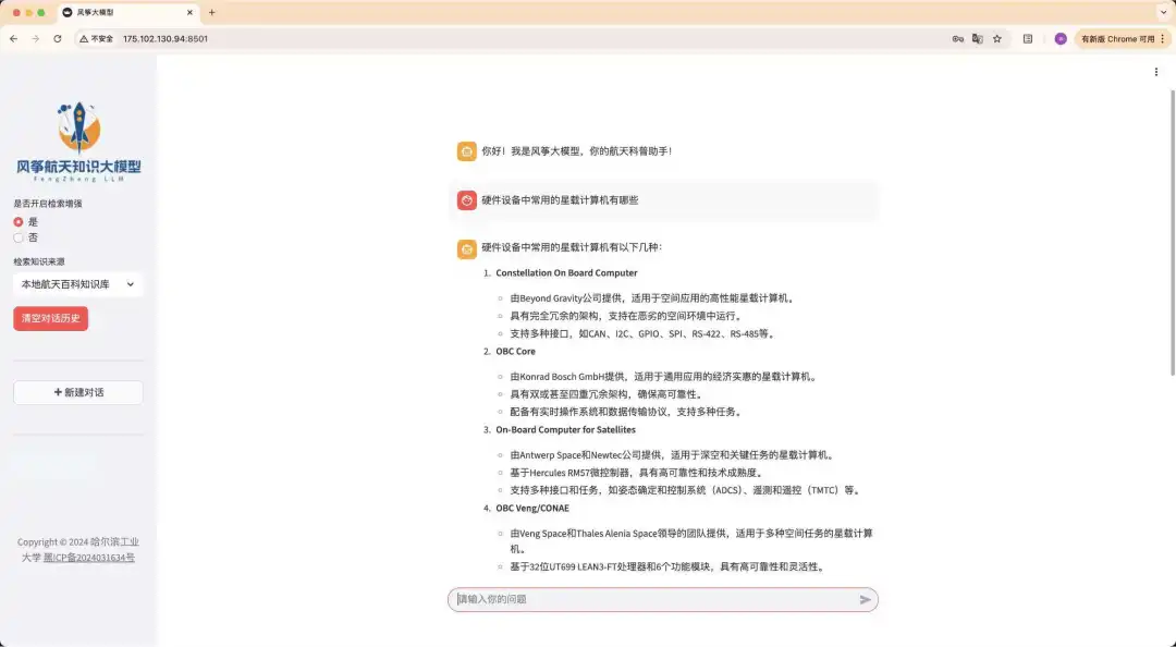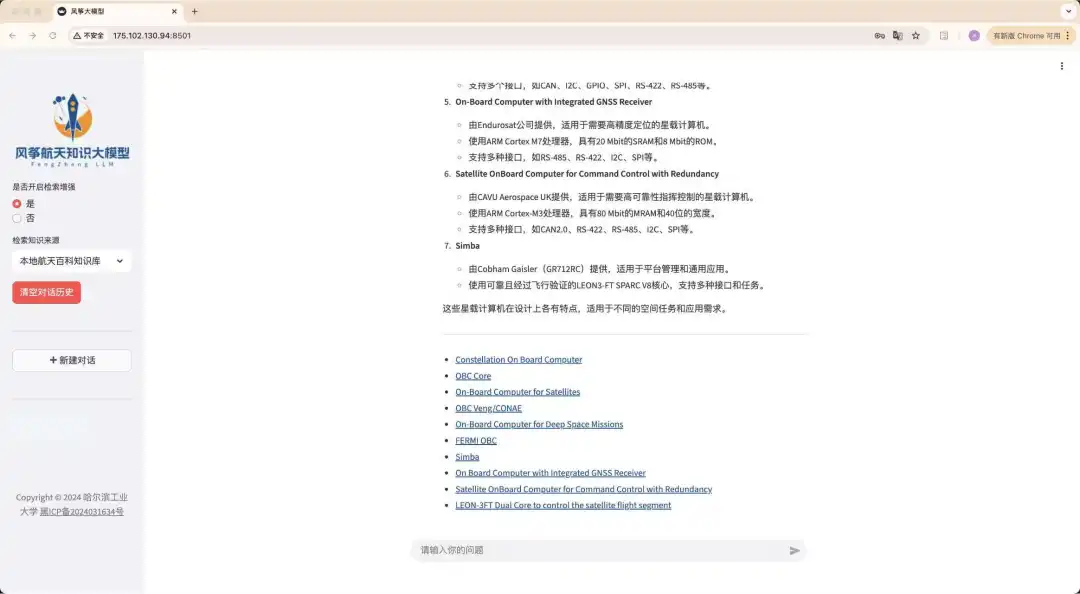 在系统演示中,当用户咨询“硬件设备中常用的星载计算机有哪些”时,系统能够自动给出不同类别硬件的关键性能指标、典型应用场景及参考链接,帮助用户在短时间内建立起对相关工程方案的整体认知,读者可以访问 http://175.102.130.94:8501/ 进行试用。