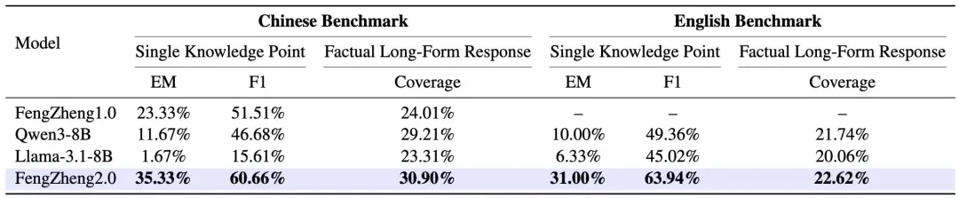 为系统评估模型升级效果,团队构建了全新的中英文航天知识评测体系,覆盖单知识点问答与多知识点综合推理等多种任务形式。评测结果显示,风筝 2.0 在中文航天知识理解方面持续提升,在准确性、覆盖度和逻辑一致性上均优于 1.0 版本。与此同时,其英文能力达到行业领先水平:在中英文双语评测基准中,风筝 2.0 相较 Qwen3-8B 的平均性能提升达 12.63%,展现出优异的跨语言知识迁移能力。