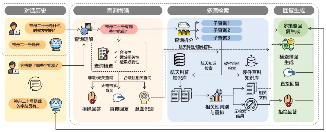 在实际使用场景中,用户的需求往往并不严谨,甚至带有模糊指代或复合条件。针对这一特点,卫星硬件百科系统引入了面向航天领域的智能检索增强机制,并与航天科普问答助手融合。
