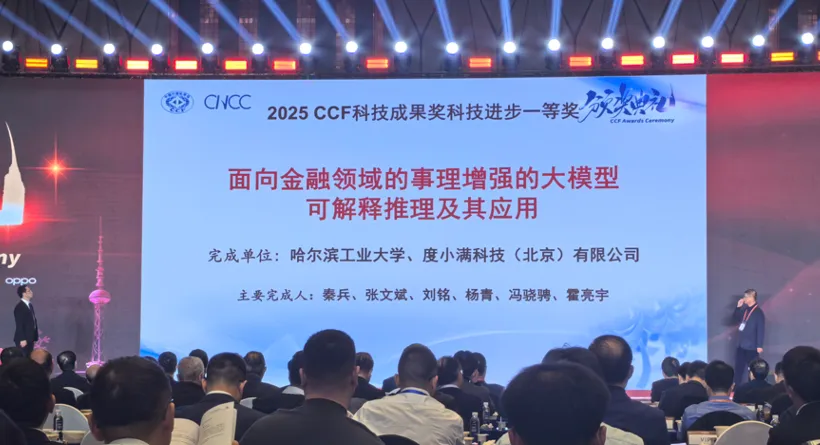 哈尔滨工业大学计算学部秦兵教授牵头完成的《面向金融领域的事理增强的大模型可解释推理及其应用》荣获“CCF科技成果奖”科技进步奖一等奖。项目联合度小满科技(北京)有限公司相关专家共同完成。CCF理事长孙凝辉院士、奖励委员会主席李晓明教授为秦兵教授颁奖。